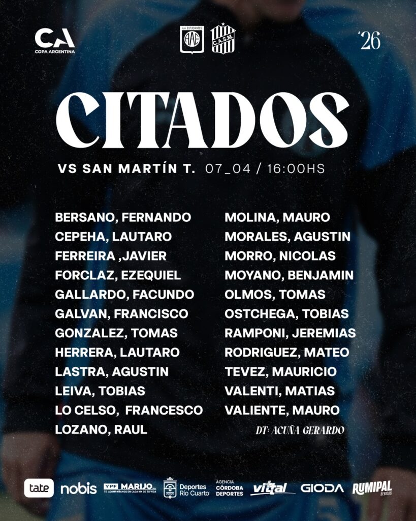 Gran salto para la carrera de Mateo Rodríguez. El jóven laboulayense, jugador de Estudiantes de Río Cuarto, figura en la convocatoria del partido que este martes disputarán el león y San Martín de Tucuman desde las 16:00hs en el Gigante de Alberdi, por los 32vos de final de Copa Argentina.